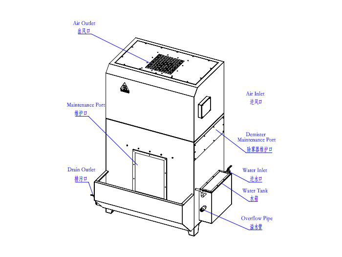 Пад адмоўным ціскам, створаным вентылятарам, пылавы газ уваходзіць у модуль фільтрацыі вады і ўступае ў цесны кантакт з вадкасцю (звычайна вадой). Дзякуючы інерцыйнаму ўдару паміж кропелямі вады і часціцамі пылу і іншымі механізмамі збору, прылада эфектыўна захоўвае вадкія або цвёрдыя часціцы з дыяметрамі ў3-30 мкмдыяпазон, а таксама выдаляе некаторыя газавыя забруджвальнікі. Вада цягнецца ўверх патокам газу; у спалучэнні з бафелем і дэміністрацыйным блокам, адбываецца падзел газу-вадкасці і вадкасць вяртаецца ў бак, дасягнуўшырэцыркуляцыя вады без помпы . Сістэма дасягае эфектыўнасці ачысткі ≥90% для часціц больш за 10 мкм.